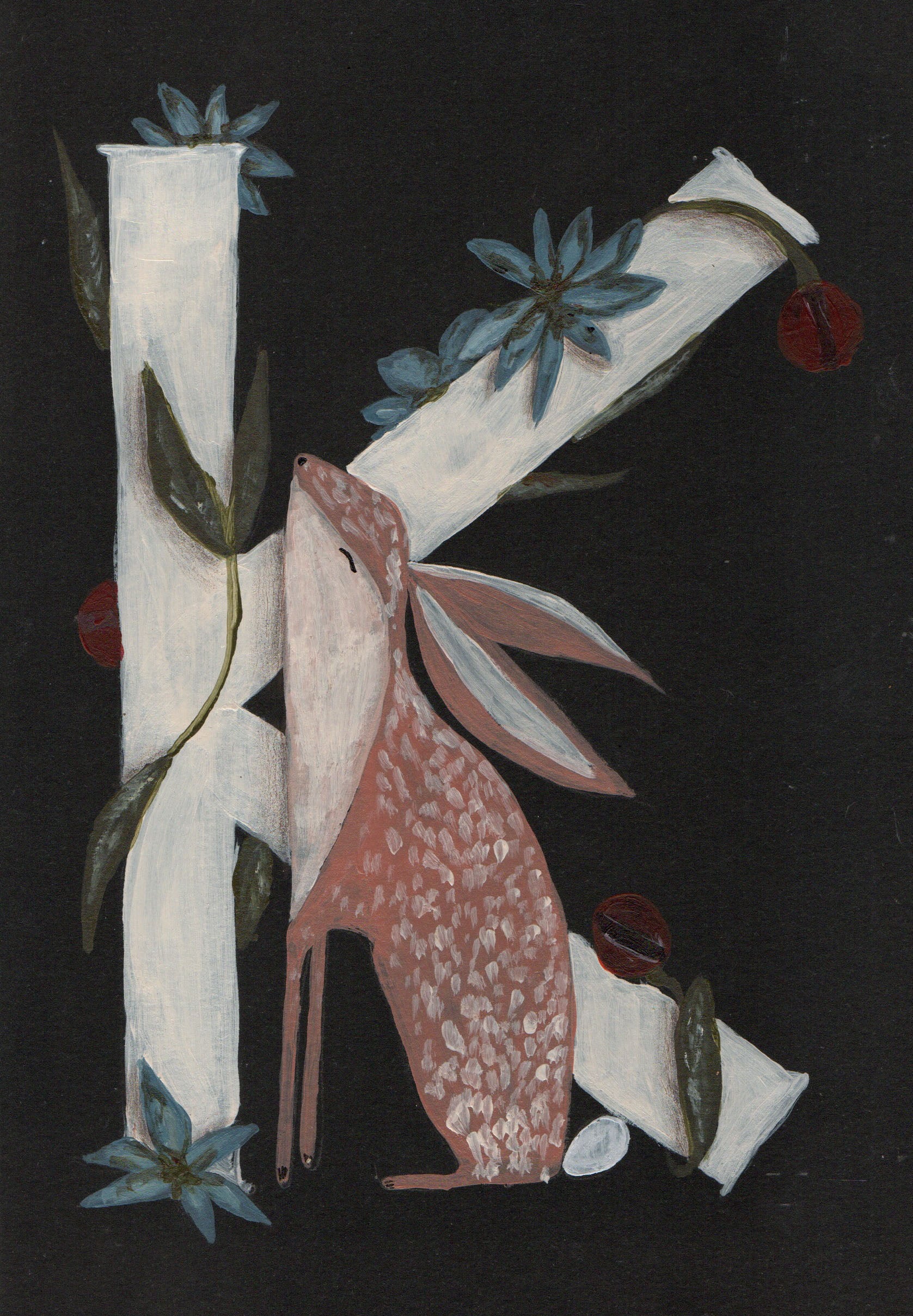 Printas kurtas akriliniais dažais ir pieštuku. Kiekviename printe vaizduojama raidė ir ją atitinkantis gyvūnas ar paukštis.