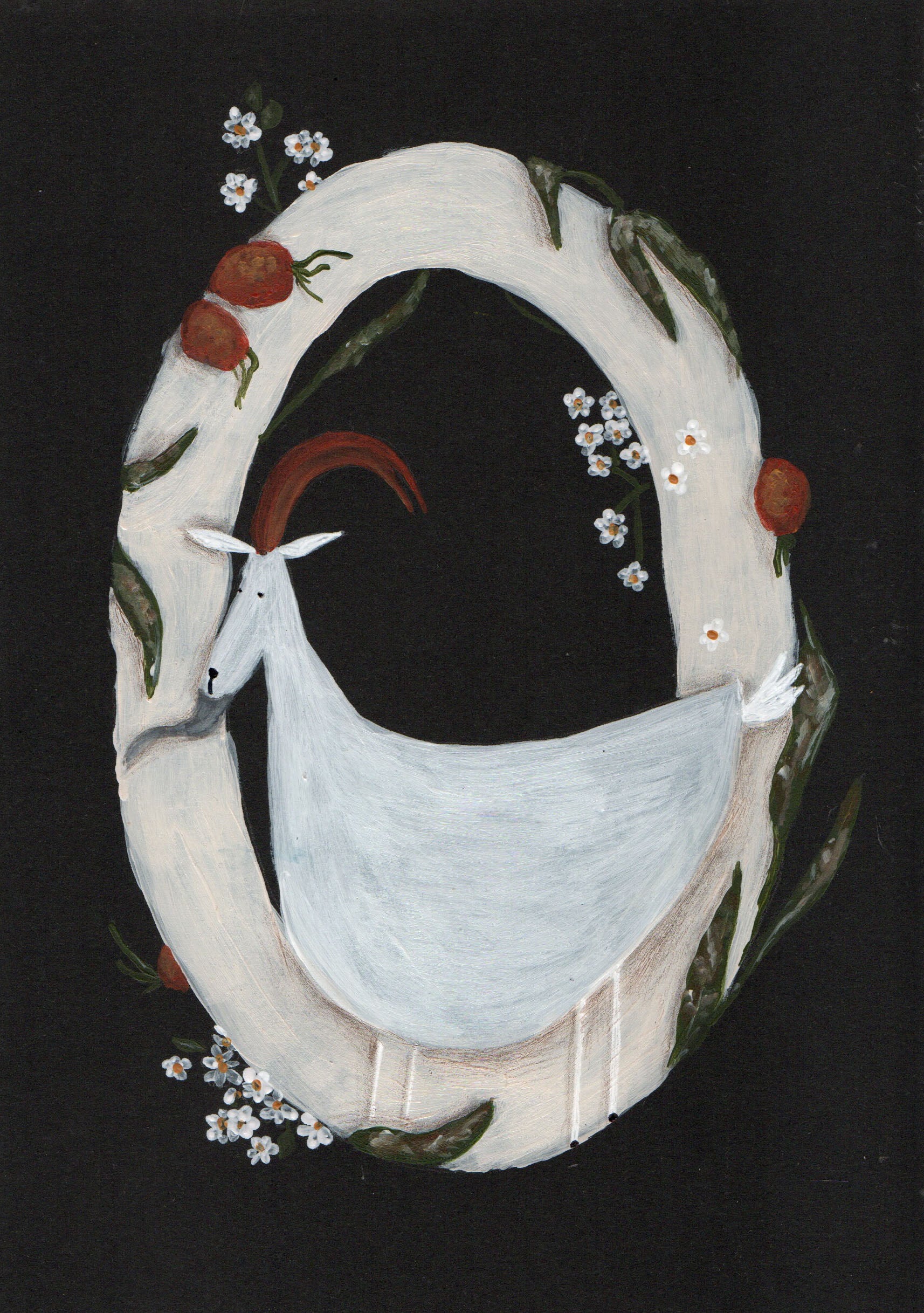 Printas kurtas akriliniais dažais ir pieštuku. Kiekviename printe vaizduojama raidė ir ją atitinkantis gyvūnas ar paukštis.
